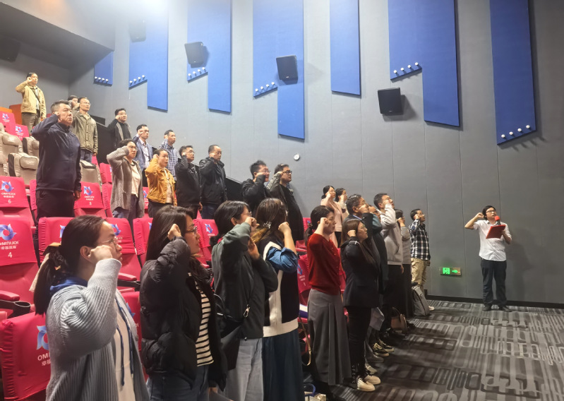 观影结束后,活动进入庄重的仪式与学习环节。在彭静同志的领誓下,全体党员面向党旗,高举右拳,重温入党誓词,铿锵有力的誓言回荡在现场,表达了为党的事业奋斗终身的坚定决心。随后,在李春光同志的组织下,全体党员现场缴纳了党费,履行党员义务。紧接着,全体党员集体诵读了《中国共产党章程》党员第六条,进一步明确了党员的权利与义务,强化了身份意识和责任担当。