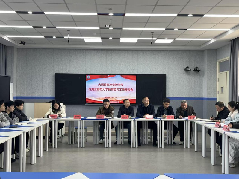31日上午,检查组转赴大悟县泉水实验学校。泉水实验学校建成于2023年,是县城区内唯一一所九年一贯制学校。该校由于规模初立,思求才俊,因而格外重视与我校的实习对接。在党委书记宗红卫,校长刘军,副校长汪攀、范晓丽等校领导的带领下,检查组参观了校内的大悟县红色文化长廊和泉润少年积分站,深切感受到了该校在传承革命基因、打破教育常规方面所做出的努力与探索。而后检查组与11名实习生举行了座谈,会上范晓丽副校长作为我校2004届校友,从职业技能巩固与精神财富积累两方面强调了教学实习的重要意义。实习生代表也立足于自身的实习经历,分享了在课堂教学中的实践感悟与成长收获。