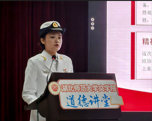 道德宣讲环节,彭江浩老师结合自己三十余年扎根一线教书育人经历,述说着一桩桩、一件件育人故事,传递师者力量,彰显育人温度。她谈到,教师的幸福感来自于耕耘的收获、学生的成长,累并快乐着!她强调,立德树人就是一棵树摇动另一棵树,一朵云推动另一朵云,一个灵魂唤醒另一个灵魂,并激励广大教师要把抗战精神、爱国热情融入血脉、铸入师魂,以创新教学理念重塑课堂,以扎实专业素养启迪智慧,以温暖教育情怀滋润心灵,践行“为党育人、为国育才”的使命与担当。2025级新闻与传播专业研究生张思澳,作为一名海军退役士兵,分享了军旅淬炼中的“酸甜苦辣”,在一场场训练、一次次任务中以实际行动传承发扬抗战精神,努力成为既能扛得起责任,也能拿得出成绩的新时代大学生。