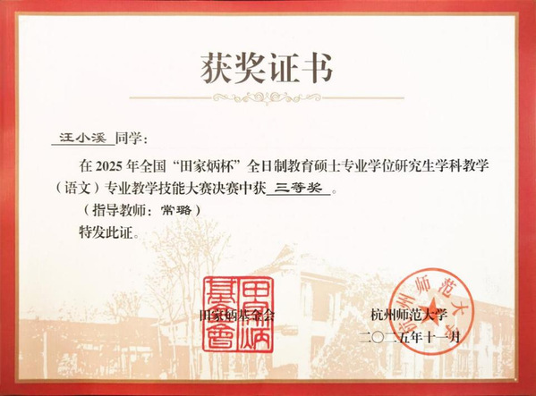 近日,在2025年全国 “田家炳杯” 全日制教育硕士专业学位研究生学科教学(语文)专业技能大赛中,我院2023级研究生汪小溪凭借扎实的专业能力与出色的教学表现,获得全国三等奖。