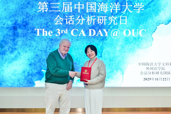 2025年11 月 21 至 22 日,由中国海洋大学外国语学院主办的第三届会话分析日(CA Day)在青岛顺利召开。湖北师范大学文学院田咪博士受邀作为大会专家作主题报告,其研究论文《汉语自然口语中的抵抗行为 —— 以请求行为的抵抗回应为例》荣获优秀青年论文一等奖。值得关注的是,田咪博士是本次会议受邀专家中唯一一位汉语研究者。