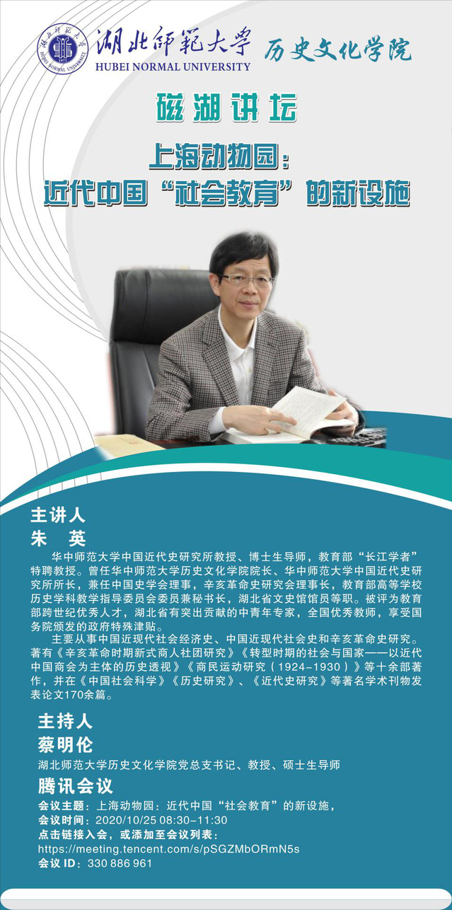 2020年10月25日上午8点30分,教育部“长江学者”特聘教授、华中师范大学教授、博士生导师朱英应邀在腾讯会议为我院师生开展了一场题为“上海动物园:近代中国‘社会教育’的新设施”的学术讲座,讲座由我院蔡明伦教授主持。我院张泰山、李柏林等老师与150余名学生共同在线聆听。