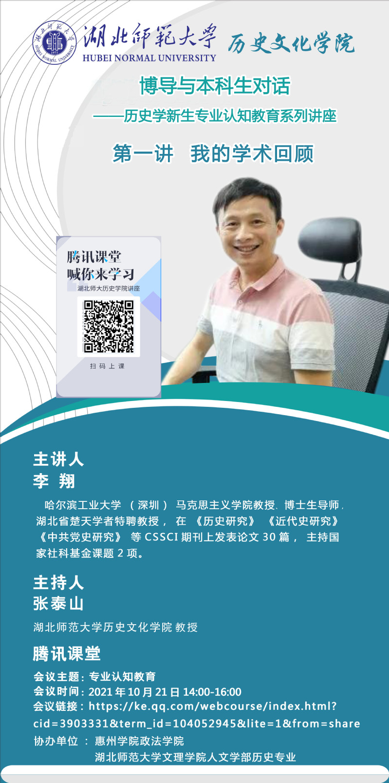 第一讲于2021年10月21日通过腾讯课堂,邀请哈尔滨工业大学(深圳)马克思主义学院李翔教授做主题为“我的学术回顾”线上讲座。会议由历史文化学院张泰山教授主持。