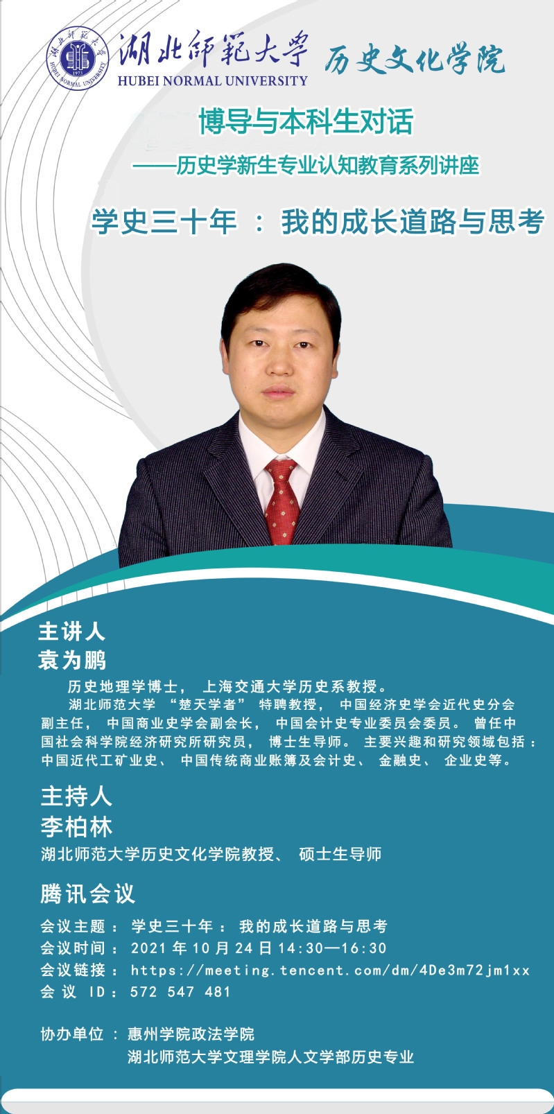 讲于2021年10月24日通过腾讯会议,邀请上海交通大学历史系袁为鹏教授做主题为“学史三十年,我的成长道路与思考”线上讲座。会议由历史文化学院李柏林教授主持。