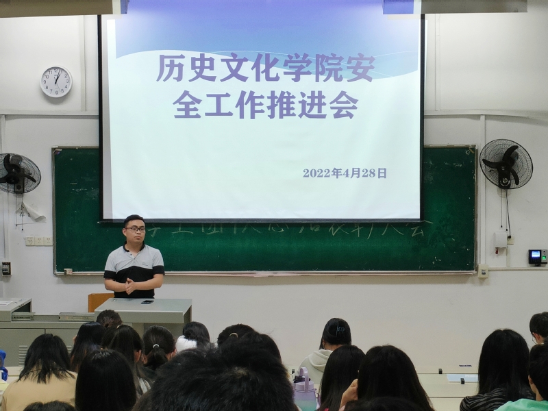 2022年4月28日下午19:00,历史文化学院在教育大楼1J12教室组织召开了学院学生干部安全工作推进会。会议由杨绍浩老师主持讲话。历史文化学院党总支副书记黎哲,辅导员杨绍浩、王雅菲,党团学负责人,各班班长、团支书、学习委员参会。