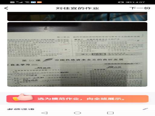 1、帮助学生梳理线索,让学生从整体上掌握民族资本主义的发展历程。 2、通过四个词语概括民族资本主义工业每一阶段特征。 3、每组抽出一名同学复述四个时段的民族资本主义发展状况,诸如时间段、表现、原因、影响等。 | 1、各组线上讨论本组同学的发言,并发言补充、纠正和完善,形成完整的知识点和知识结构。 2、积极配合老师完成导学任务,主动参与互动。 | 1、通过情景再现,联系教材以小见大分析中国民族资本主义发展的曲折性。 2、通过各个场景的分析,引导学生得出一些结论,增强爱国意识。 | |||
