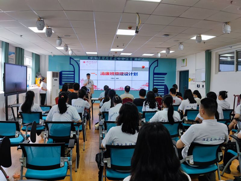 随后,班长褚昊主要从积分制度、导师联系制度、清廉主题活动、廉洁推文建设等方面汇报了清廉班级建设的基础以及今后建设目标。紧接着,蔡菲菲同学从课前十分钟、班级活动、专业赛事、特色礼仪培训、专业见习等方面向所有人展示了班级目前已经取得的建设成绩。李芙蓉同学带领大家一起走进“习语习廉”主题学习。通过对习近平总书记关于“公生明,廉生威”经典引用的讲解让大家进一步了解到廉洁的文化内涵和历史渊源及当代意义。