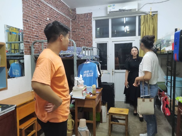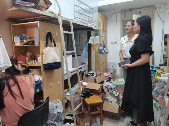 2022年6月16日晚,历史文化学院党总支副书记黎哲老师和辅导员王雅菲老师前往18级毕业生宿舍进行探访和临行慰问。