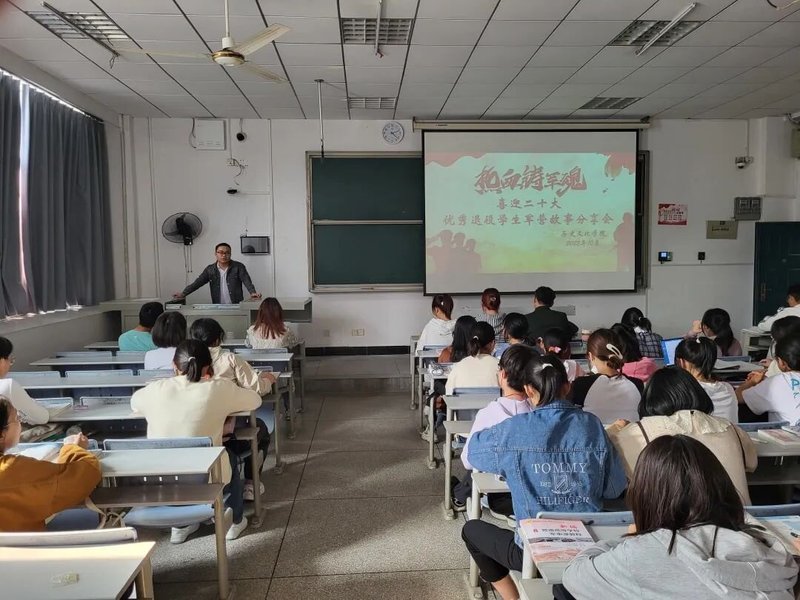 10月16日,党的二十大胜利召开,为深入贯彻习近平强军思想,普及国防知识,涵养家国情怀,激发同学们参军报国的热情,2022年10月17日下午14:20,历史文化学院“献礼二十大,热血铸军魂”优秀退役学生军旅故事分享会在科技大楼9402教室隆重召开。