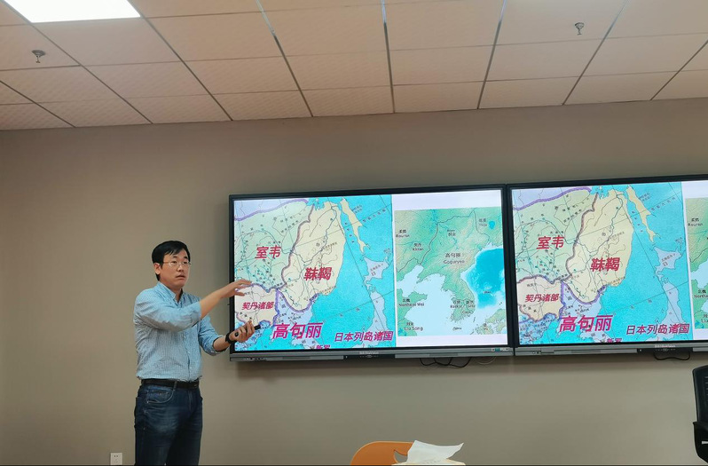 姜成山老师将“渤海‘旧国’新思考”作为主题进行汇报,首先向师生们介绍了渤海国基本史料,对《两唐书》《五代会要》关于渤海靺鞨的记载进行讲解,以及日本对渤海国的记载《续日本纪》《类聚国史》等史料梳理,并且对中日史料记载进行对比。然后展示了渤海国王系、都城变迁的基本史料,介绍了中日韩学者的研究概况。最后通过考古发掘印证推理。