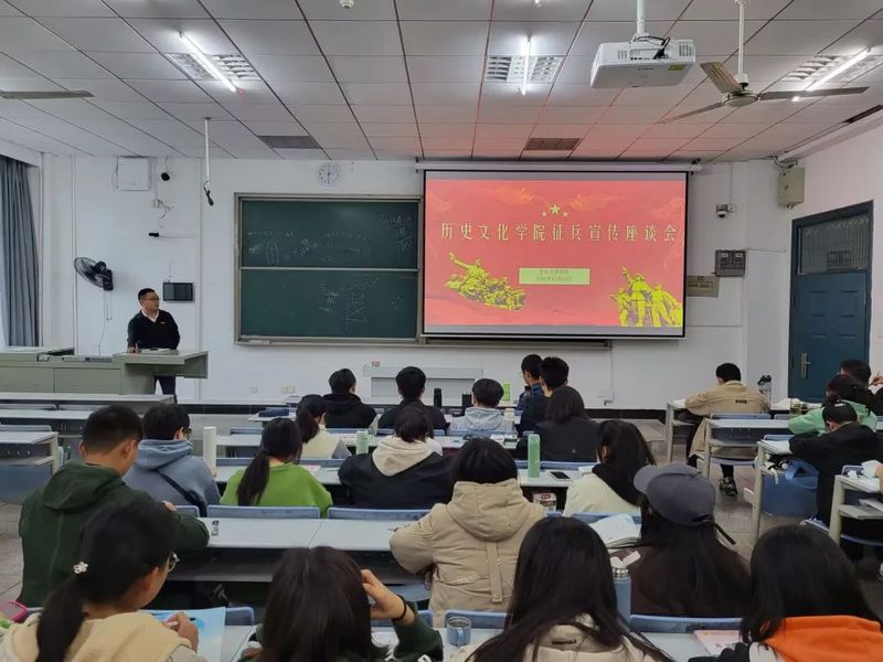 为深入贯彻习近平强军思想,配合即将展开的全国春季征兵工作,2022年11月14日下午14:20,历史文化学院“征兵政策宣传”座谈会在学校科技大楼9402教室隆重召开。本次座谈会由历院自律委员会退役学生服务部组织,学院主管征兵工作的辅导员杨绍浩主讲,全院有参军意愿的同学及所有2022级历史学专业学生参与了座谈会。