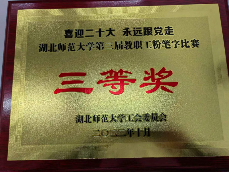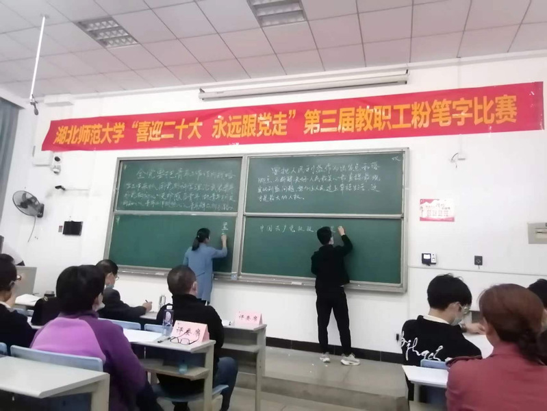 为进一步推动校园文化建设,为迎接党的二十大胜利召开营造良好氛围,提高教师教学基本功水平,展示教师良好职业素养,我校特举办“喜迎二十大,永远跟党走”湖北师范大学第三界教职工粉笔字比赛。