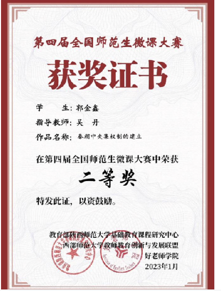 在已经结束的第四届全国师范生微课大赛中,我院学子郭金鑫的参赛作品《秦朝中央集权制的建立》喜获二等奖。