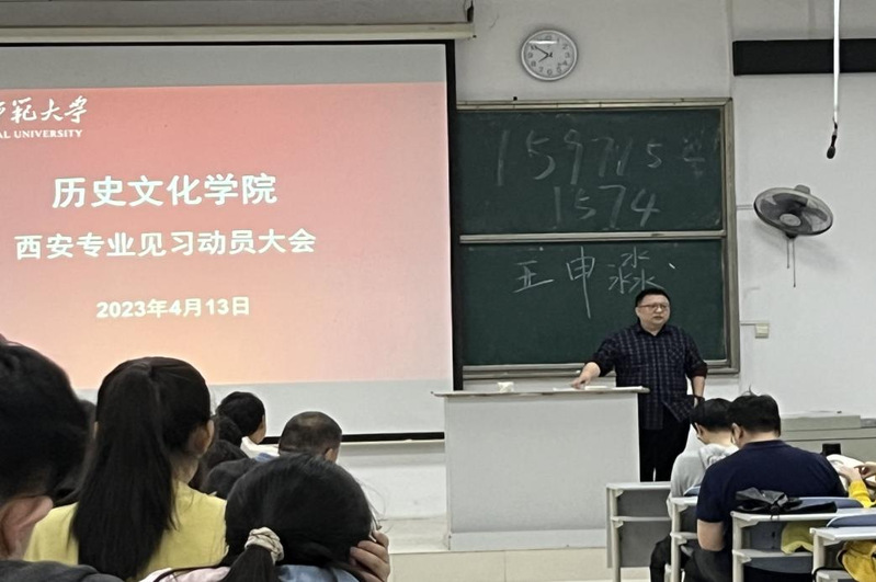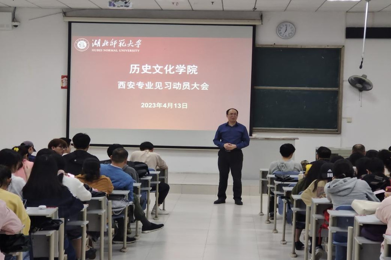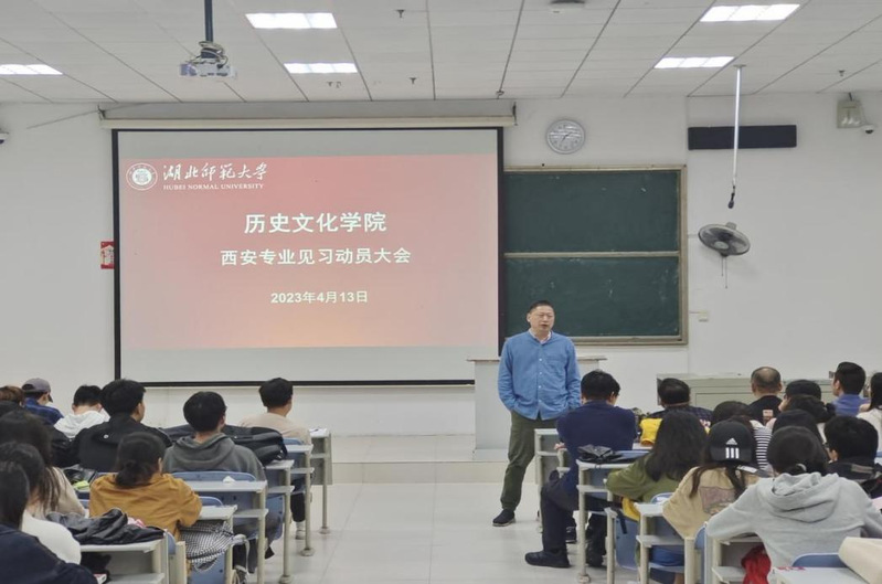 历史文化学院于2023年4月13日晚7时在21AT05召开历史学2001、2002班、旅游管理与服务教育专业2003班以及中国史22级研究生赴西安专业见习动员大会。蔡明伦院长、学院教学院长李建刚、20级各班班主任及学生参加会议、这是历史文化学院首次不同专业、本科与研究生一起参加的见习活动。会议由周鑫老师主持。