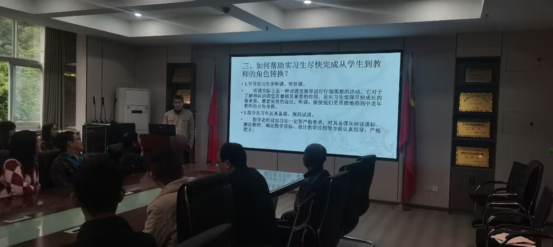 随后,校内指导老师李柏林老师做了如何帮助实习生尽快完成从学生到教师的角色转换的专题讲座。