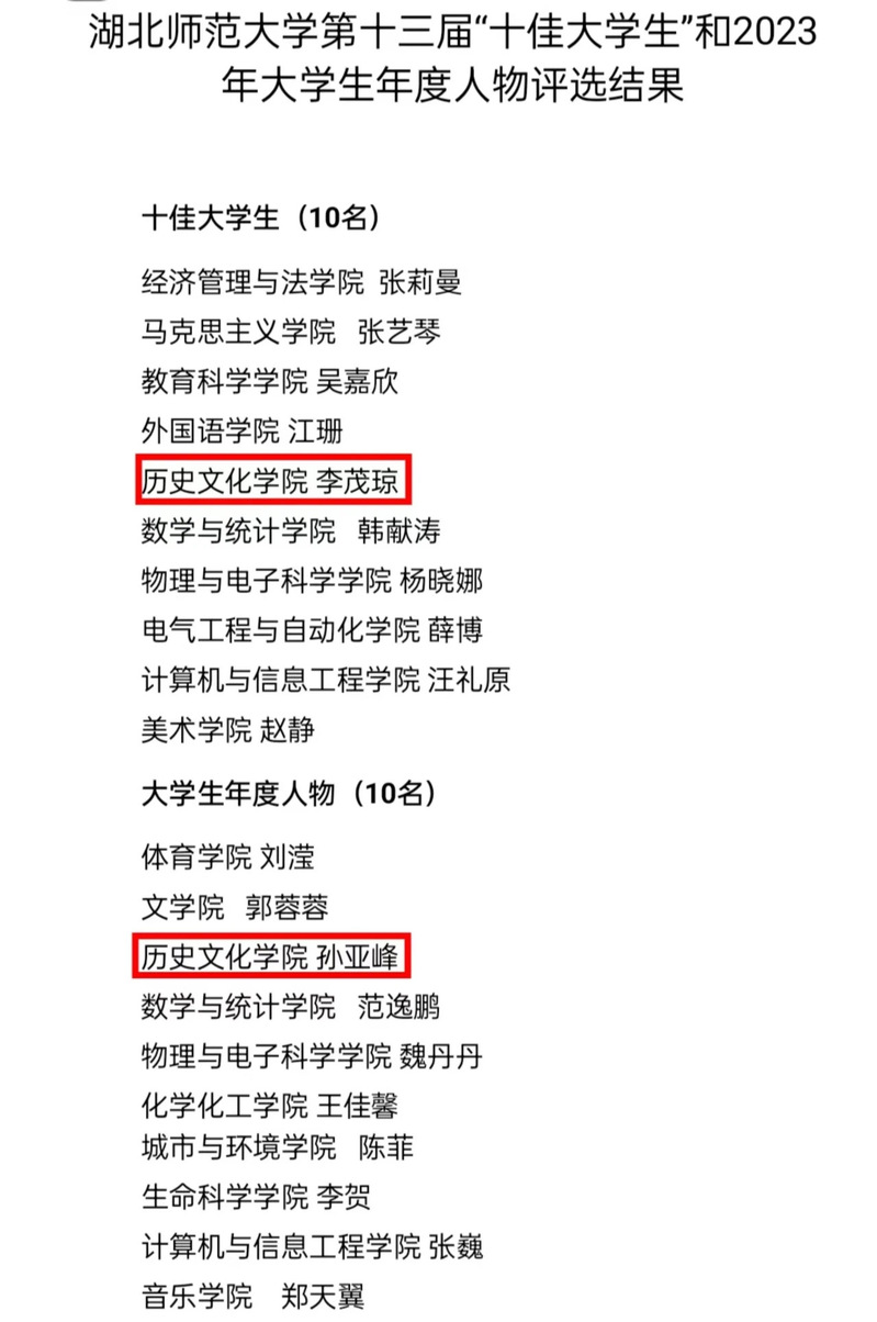 此次活动经过个人申报、学院推荐、大众投票、学生工作部(处)审核、学校评审等层层严格的筛选,恭喜我院李茂琼、孙亚峰两位同学分别入选“十佳大学生”和2023年大学生年度人物。