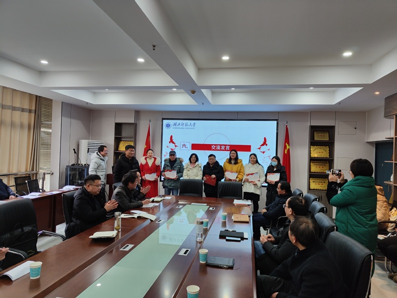 在集体学习环节,由支部书记穆昭阳同志领学了《在文化传承发展座谈会上的讲话》,进一步结合学院专业特点与未来发展阐述了文化传承与保护发展的必要性,对中华文明的突出特性及重要性进行解读。接下来由刘千明同志领学了新颁布的《事业单位领导人员管理规定》《事业单位工作人员处分规定》《事业单位人事管理回避规定》,王参民同志领学了习近平总书记在中央金融工作会议和在上海考察时重要讲话精神。最后,为了持续深化党员干部“一下三民”主题实践活动,号召党员干部当好模范先锋,落实活动主题,加大民生实事办理力度。今年获得“荆楚好老师”荣誉称号的向明亮老师,以自己多年的教学科研实践经验和所得,对“立足岗位谋发展”这一主题做了针对性强、内容鲜明的交流发言。