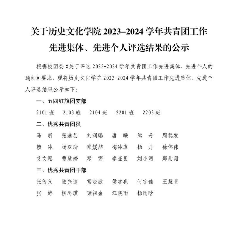 【公示】历史文化学院2023—2024学年共青团工作先进集体、先进个人评选结果公示