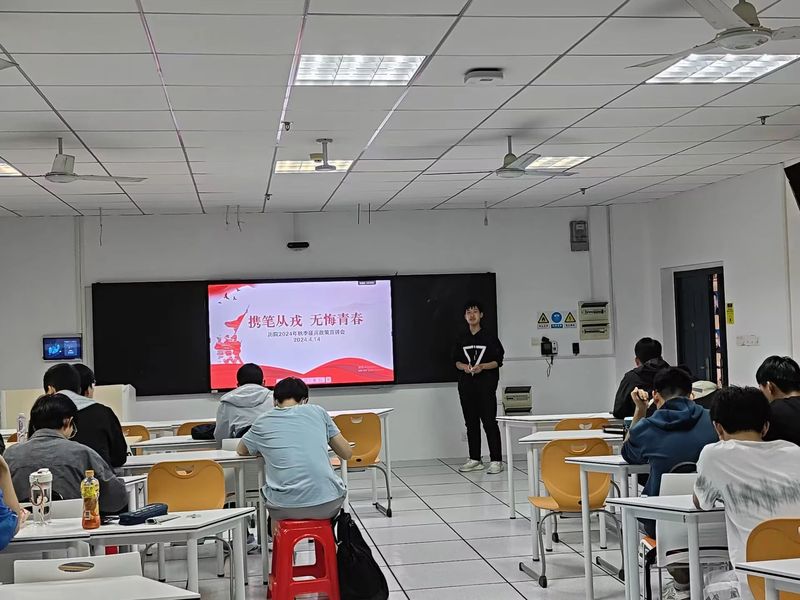 为扎实开展2024年征兵工作,贯彻落实国家征兵政策,激发青年学生积极投身国防事业,提高我院学生的国防意识,以实际行动践行“四个自信”,历史文化学院退役学生服务部于4月14日晚七点在人文楼21A305教室召开“携笔从戎,无悔青春”——征兵政策宣讲会。由退役学生服务部部长彭菁俊主持活动,并动员了历史文化学院各班级男生代表参与本次活动。