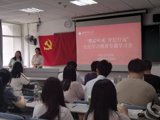 为进一步加强纪律建设,确保全体学生党员统一意志、统一行动、步调一致向前进,历史文化学院于2024年5月23日在人文楼21A101教室开展“履霜知戒,守纪行远”党纪学习教育专题学习会。历史文化学院党委副书记黎哲主讲,学生第一党支部书记王雅菲以及全体毕业生党员参与此次会议。