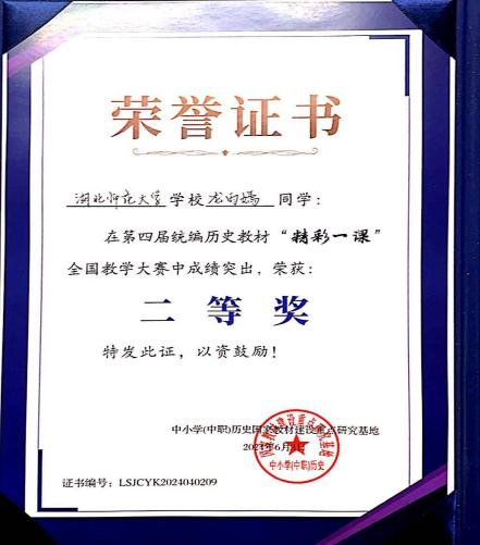 2024年5月30日—6月3日,第四届统编历史教材“精彩一课”全国教学大赛暨义务教育历史教材研究高端论坛在长春隆重举行,我院历史学专业2021级本科生龙雨嫣同学荣获二等奖。