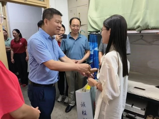 在宿舍里,马列军书记详细询问了新生们的入住情况以及碰到的困难,并代表学校为家庭经济困难学生送去了生活物质、军训服、购物券等。交谈之余,他对新生们提出期望:一是要珍惜在校时光,努力学习专业技能,积极参加校园文化活动,拓展自己的知识面和视野;二是注重身体健康,增强体育锻炼,做好日常生活管理;三是加强文明寝室建设,处理好宿舍关系,注重用电安全和消防安全,遵循学校的宿舍管理规定。