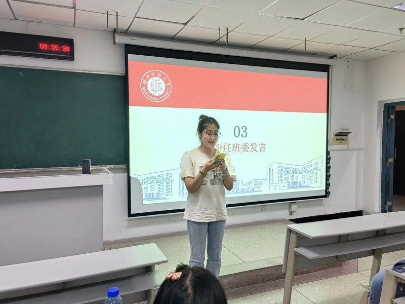 而后,新任班委成员上台发言。首先,他们向班主任及全体同学表达了诚挚的感谢,感谢大家的信任与支持。随后,针对本学期的班级事务,他们详细阐述了计划与设想,其发言内容赢得了台下同学的热烈掌声。