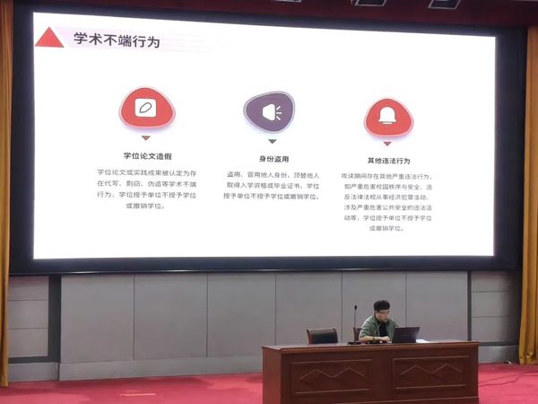 随后,他通过展示某高校学生因参与境外非法宗教组织而被开除学籍的通报文件,明确提出这类行为不仅违法犯罪,更会给个人前途带来难以挽回的影响。谈到学术不端问题时,他翻出真实事例,逐个说明论文代写、数据造假、抄袭剽窃等行为的认定标准与严重后果,并告诫同学们,学术诚信关系到学位授予和未来职业发展,任何侥幸心理都可能酿成终身遗憾。