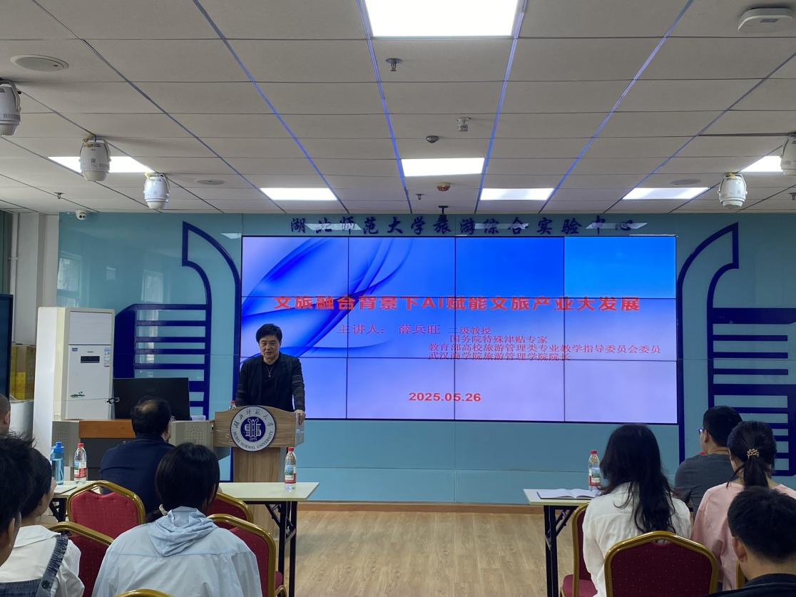5月26日上午,武汉商学院旅游管理学院院长薛兵旺教授应邀走进历史文化学院旅游综合实训室,开展题为“文旅融合背景下AI赋能文旅产业大发展”的专题讲座。本次活动由历史文化学院院长蔡明伦教授主持,旅游专业全体师生齐聚一堂,共赴这场知识盛宴。