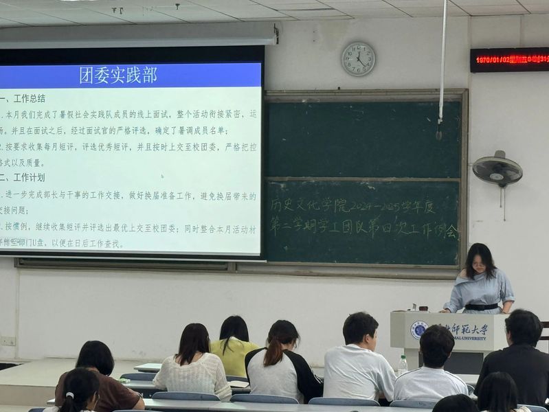 5月15日下午,历史文化学院学工团队2024—2025学年第二学期第四次工作例会在人文楼21AT05召开。出席本次会议的有辅导员郑甜甜老师、康博仁老师及第四十七届学工团队全体成员。学工团队成员围绕工作汇报、换届部署、经验交流及近期重点工作展开深入研讨,旨在总结成果、优化流程、传承经验,为后续工作奠定坚实基础。