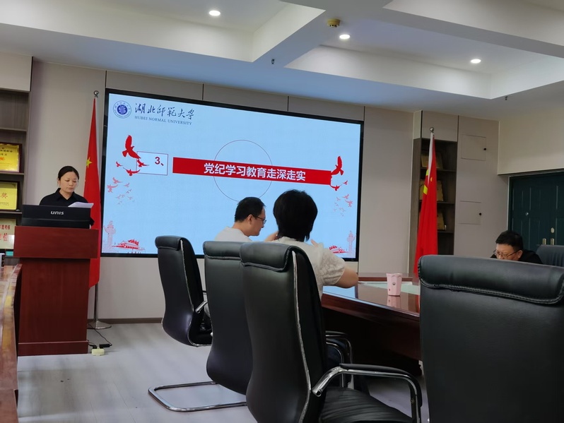 接下来为本月过政治生日的王军、王参民、邱晓磊、康博仁、祝志芬、杨庆等同志送上生日贺卡。本月主要理论知识学习由支部书记领学《加快建设文化强国》,强调了文化建设的重要性,以及涉及学院特点的文旅融合发展,以湖北文旅为案例开展讲述分析。其次,由魏仕俊同志领学《八项规定改变中国》,这也是对当前扎实开展深入贯彻中央八项规定精神学习教育的回应,并持续深化学习研讨相关典型案例,开展警示教育,促成党员干部对照剖析反思,深入交流研讨,以案促改,以案促学。并由冯文娟同志进行补充,加强对在座党员同志的警示教育,同时对八项规定改变工作作风进一步阐读,开展对《中国共产党纪律处分条例》的深入集中学习,对于相关规定解读、微视频等网络资源,不断推动党纪学习教育常态化长效化。最后是针对即将迎来的学生毕业季,开展毕业生党员教育。