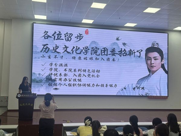 为了帮助新生更好地了解学生会和团委的职能,吸纳新鲜血液,9月7日19时,历史文化学院学工团队组织举办院学生会、团委招新宣讲会。本次招新宣讲会由学生会和团委联合举办,旨在为新生提供一个展示自我、服务同学、锻炼能力的平台,吸引了众多2025级新生参与,现场气氛热烈,为后续招新工作做好铺垫。