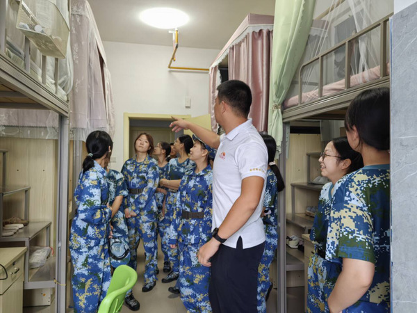 九时许,团队转至女生宿舍。在25栋1030宿舍,孙玉钟老师面向全体寝室长详细讲解内务规范,涵盖床铺整理、桌椅摆放、洗漱用品收纳及公共卫生维持等细节,指出“内务整理不仅是军训的必修课,更是个人自律和集体责任感的体现”。
