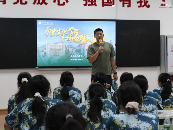 随后,孙玉钟带领同学们学唱《强军战歌》、《中国军魂》以及校歌《我们是光荣的湖师人》。激昂的旋律、铿锵的歌词,点燃了现场每一位同学的热情。同学们声音洪亮、气势如虹,歌声汇聚成情感的海洋,传递着对祖国的热爱、对军人的敬仰以及对校园的归属感。