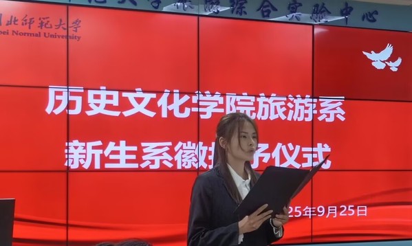 为助力旅游管理与服务教育专业新生适应大学学习生活、强化情感联结与集体认同感,湖北师范大学历史文化学院旅游系系徽授予仪式于9月25日下午16时在人文楼旅游系实训室B307如期举行。系徽授予仪式由历史文化学院主办,旅游系、旅游协会承办,燕归巢旅游志愿服务团队协办。历史文化学院党委书记冯文娟、旅游系全体老师、旅游系2305班全体学生共同参与。