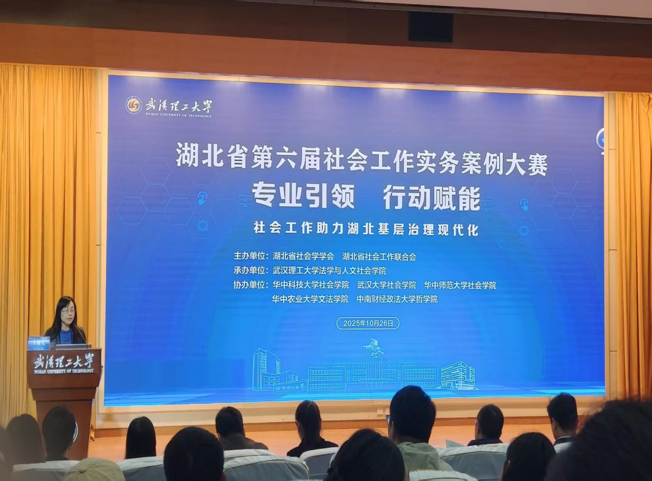 2025年10月26日,湖北省第六届社会工作实务案例大赛决赛在武汉理工大学马房山校区西院会议中心圆满落幕。湖北师范大学历史文化学院段丹老师带领社会工作专业学生陈雪咪、刘育伸、徐祺恺、井玉洁、任玉平携“农村留守儿童行为习惯养成的社会工作介入—P村社工实务案例实践”项目参赛,历经多轮角逐,最终斩获优秀奖。