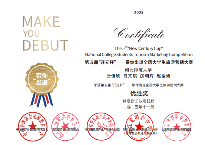 我院张佳欣、肖文琪、房朝辉、赵语浠四位同学,在第五届“开元杯”——带你出道全国大学生旅游营销大赛中荣获优胜奖!