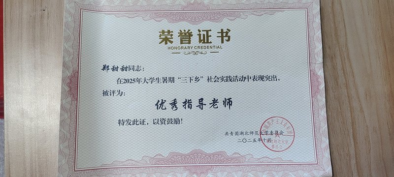 我院辅导员郑甜甜老师,在2025年大学暑期“三下乡”社会实践活动中表现突出,被评为“优秀指导老师”!