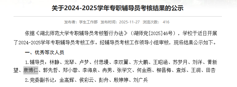 在2024年-2025年专职辅导员考核中,我院辅导员康博仁老师获评优秀!