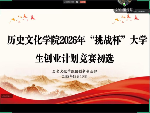 2025年12月10日中午,历史文化学院团委创新创业部举办的“挑战杯”大学生创业计划竞赛院赛于线上圆满举行。本次赛事以“激发创新潜能、点燃创业热情”为核心目标,旨在选拔一批优秀项目,为更高层级赛事储备力量,助力学子在创新创业赛道崭露头角。本场赛事由学院团委创新创业部承办,辅导员老师郑甜甜、康博仁、沙木担任评委,董世懿同学主持。