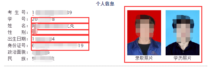 三、自查内容:考生号、学号、入学日期、预计毕业日期(2023.06.30)、专业(如有转专业情况显示专业信息为现所读专业,转专业学生班级、学部信息如未改变可不予理会)、姓名、性别、出生日期、身份证号、照片(红色为重点检查内容,尤其是学历照片,如有未睁眼、歪斜等情况及时联系)。